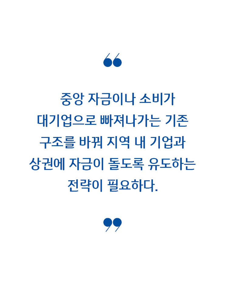 강형구구조적 위기부터 극복하자면 지역 내 자금 순환을 높여 지역 경제의 내생적 회복력을 키워야 한다. 중앙 자금이나 소비가 대기업으로 빠져나가는 기존 구조를 바꿔 지역 내 기업과 상권에 자금이 돌도록 유도하는 전략이 필요하다. 지역화폐, 특히 스테이블코인 기반 지역화폐는 지역에서만 사용할 수 있도록 설계돼 자본 역외 유출을 방지하고 지역 소상공인과 제조업체에 매출 증대 효과를 줄 수 있다. 궁극적으로 이는 지역 경제 전반의 선순환 구조를 만들어 지속 가능한 성장 기반을 마련하는 데 이바지한다.