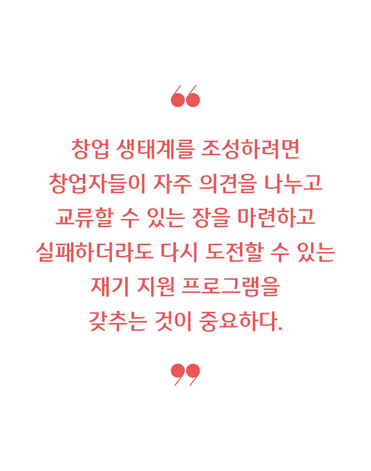 이동훈창업 생태계의 핵심은 인력이다. 지속적인 선순환을 위해서는 ‘성공 경험’이 반드시 필요하다. 인구 100만 명의 에스토니아가 유럽의 대표 스타트업 강국으로 도약할 수 있었던 배경에는 ‘100% 디지털 사회’ 구축을 위한 정부의 노력, 탈린대학교와 타르투대학교를 통한 우수 인재 공급, 2003년 ‘스카이프(Skype)’라는 유니콘 기업의 탄생이 결합해 있었다. 과거에는 정부 주도의 산업 성장이 효과를 거뒀지만 창업은 성격이 다르다. 창업 생태계를 조성하려면 창업자들이 자주 의견을 나누고 교류할 수 있는 장을 마련하고 실패하더라도 다시 도전할 수 있는 재기 지원 프로그램을 갖추는 것이 중요하다.