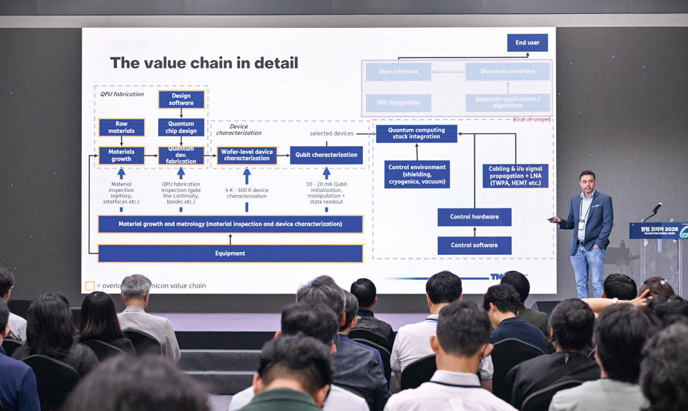 퀀텀 코리아 2025 콘퍼런스에서 발표자가 양자컴퓨팅 밸류 체인의 주요 구성 요소를 설명하고 있다. ⓒ퀀텀 코리아2025