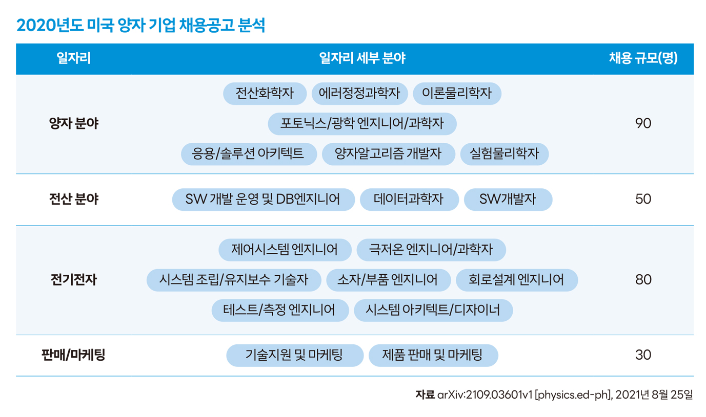 이를 위해 큐비트 성능 향상, 패키징, 제어 기술 등 해야 할 일이 많으며 주로 반도체, 전기전자, SW 등에서 할 일이 많이 있다. 따라서 양자기술을 잘 아는 것도 중요하지만 그 기술을 구현하고 완성하는 것은 따로 있다는 것이다. 미국의 양자 분야 기업, 학교, 학회의 협의체인 QED-C가 발표한 2020년도 미국 양자 기업의 인력 채용공고를 분석한 결과 19개의 일자리로 분류됐고 그중 7개가 양자기술 분야였다. 슈퍼컴퓨터나 양자컴퓨터를 사용해 직접적인 계산을 해야 하는 경우는 양자 계산의 기초적인 기술 습득이 중요한 시점이고 기존 기업들의 역량에 따라 양자 분야로 진출도 당장 가능하다. 소재, 부품, 장비 등이 대표적이다. 초전도 큐비트는 극저온에서 동작하는 수 GHz급의 RF회로이므로 극저온용 RF커넥터, RF케이블, 필터, 서큘레이터, 증폭기 등이 대략 큐비트 개수만큼 사용되고 있고 극저온냉동기를 비롯해 전량 수입하고 있다. 이온트랩, 중성원자, 광학큐비트에는 모두 레이저 및 광학 부품이 사용된다. 이들 소부장을 양자기술이라고 하지 않지만 양자컴퓨터를 만들기 위해서는 꼭 필요한 기술이다. 실제 양자컴퓨터 연구자들은 소부장의 중요성과 국산화 필요성에 대해 강조하고 있다.