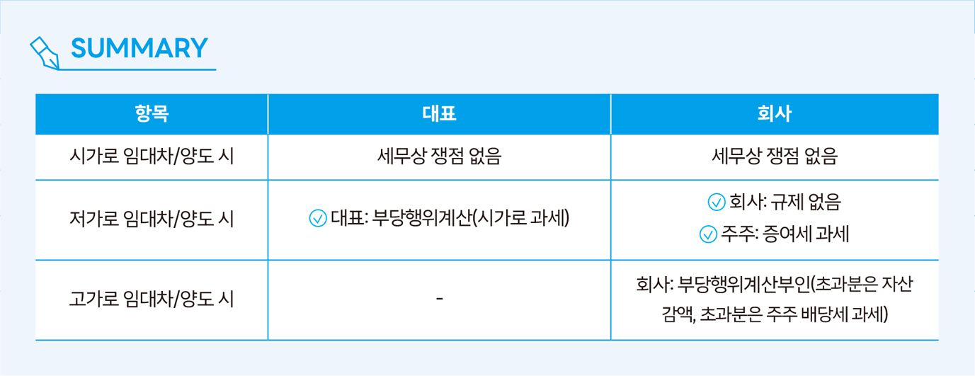 대표와 회사의 관계는 세법상 특수관계에 해당한다. 세법은 이 둘이 거래를 통해 세금을 부당히 낮출 가능성이 큰 것으로 보아 소득세법과 법인세법에서 부당행위계산 제도를 두고 있다. 이 제도는 세법상 시가보다 5% (또는 차액이 3억 원) 이상 차이가 나게 거래하면 시가에 맞춰 세금을 재계산하는 것을 말한다. 그 결과 소득세와 법인세가 증가할 수 있다.