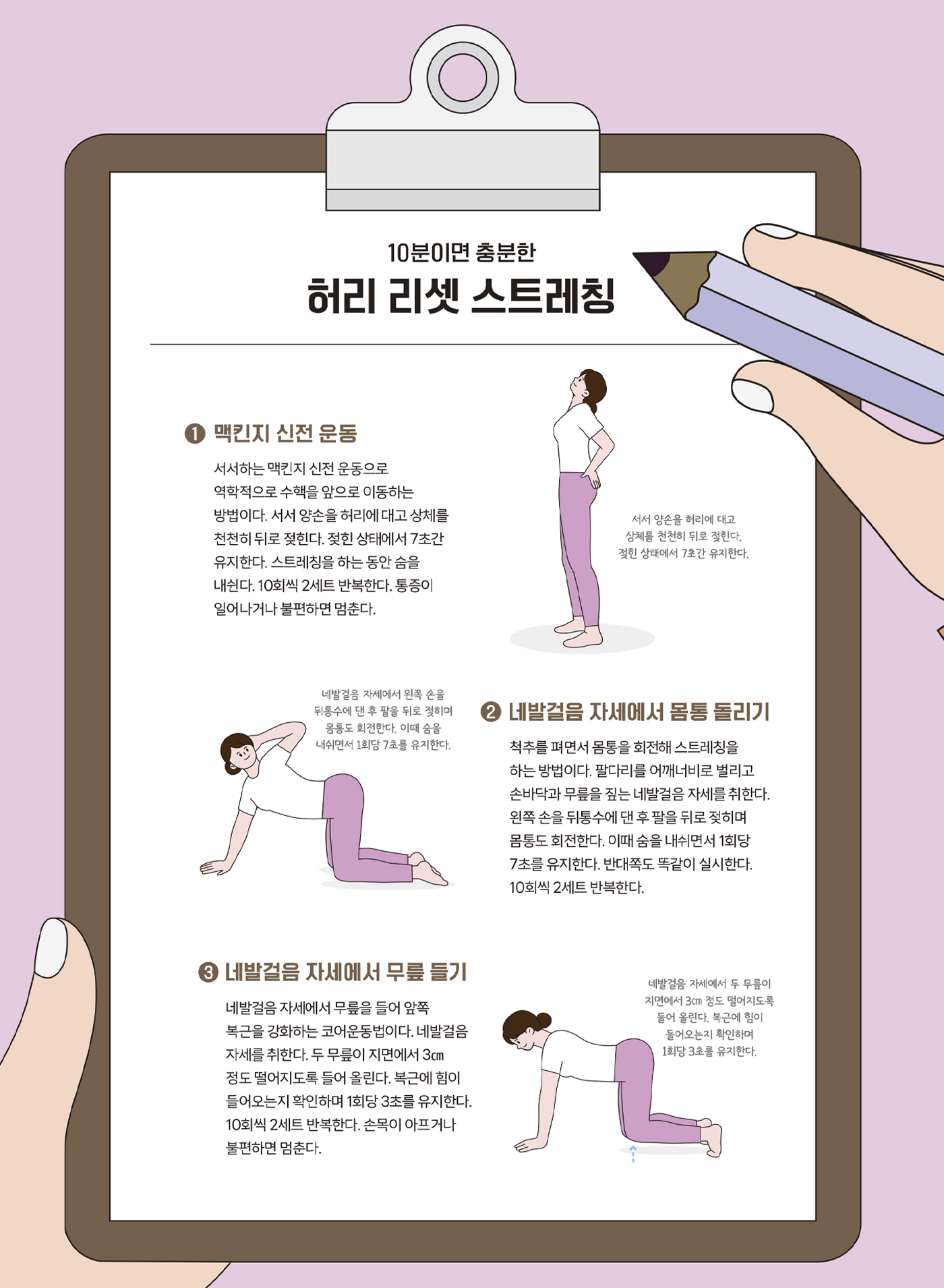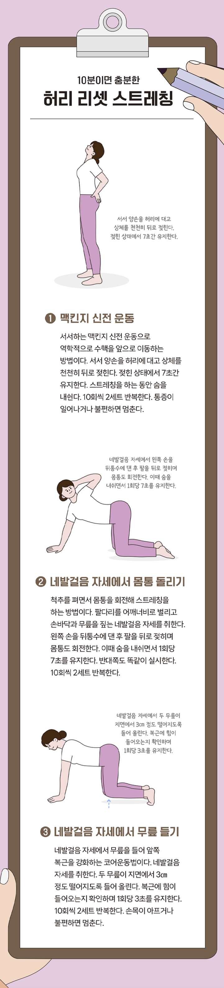 장시간 운전이나 장거리 이동 뒤에는 허리와 골반 주변 근육이 뻣뻣해지기 쉽다. 오랜 시간 앉은 자세로 고정된 척추와 둔근, 햄스트링의 긴장을 풀지 않으면 허리 통증으로 이어질 수 있다. 이번 호에서는 따라 하면 좋은 ‘허리 리셋 스트레칭’을 소개한다. 간단한 동작만으로도 굳은 몸을 부드럽게 이완하고 다시 가벼운 일상을 맞을 수 있다.