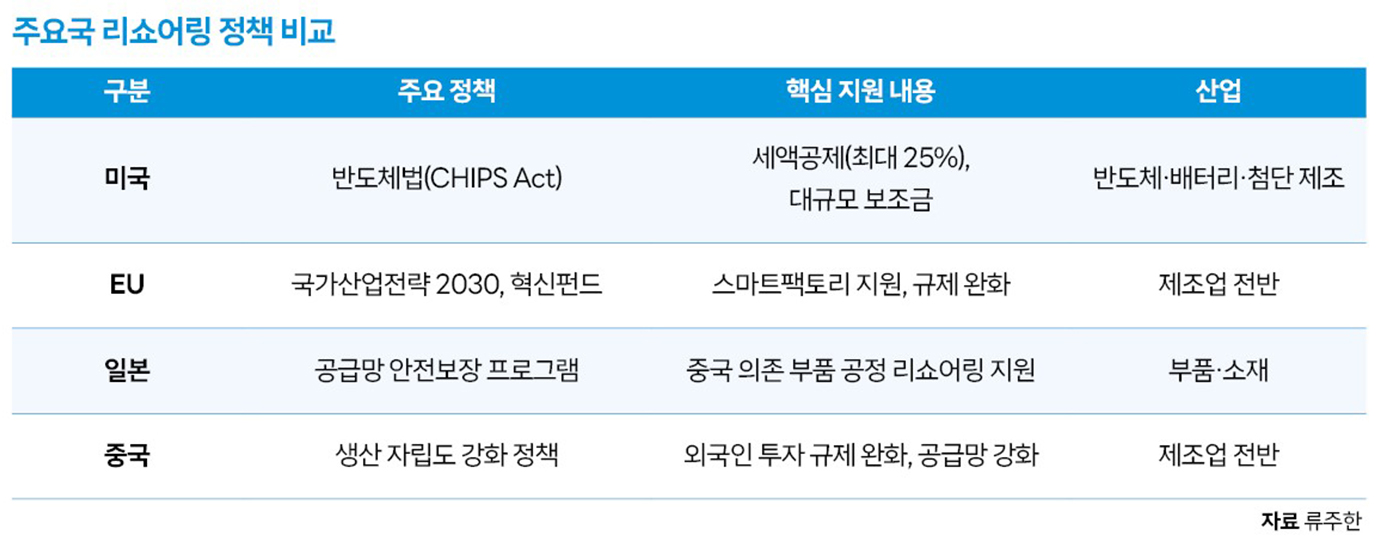 세계 각국 정부는 공급망 리스크 대응과 일자리 창출을 내세워 공격적인 리쇼어링 정책을 내놓고 있다. 미국은 대규모 세액공제와 보조금을 앞세워 제조업 귀환을 장려해 왔다. 바이든 행정부는 ‘바이 아메리칸(Buy American)’ 정책을 통해 국내 투자 시 투자액의 최대 25%에 해당하는 파격적 세액공제를 제공하는 반도체법(CHIPS Act)을 발의했다. 트럼프 2기 정부는 자국 제조업 복원을 위한 고율관세, 규제 완화를 결합한 ‘초강력 리쇼어링 드라이브’를 추진하며 중국 의존도 축소를 핵심 정책으로 내세우고 있다. EU 역시 전략산업의 역내 복귀에 박차를 가하고 있다. 독일은 ‘국가산업전략 2030’을 발표해 GDP에 제조업 비중 25% 달성을 목표로 스마트팩토리 등 혁신 기술 투자를 지원하고 있다. 프랑스를 비롯한 유럽 각국도 핵심 기술의 자국 내 생산 유치를 위한 공동 펀드 조성 및 규제 완화에 나서고 있다. 일본 정부는 공급망 안전보장을 위해 특정국 의존도가 높은 품목의 생산 거점을 타 지역으로 분산시키고 있다. 특히 중국에 의존하던 부품 생산 라인을 일본 국내로 복귀시키거나 아세안 등 제3국으로 이전을 독려하며 해당 중소기업에는 비용의 3분의 2, 대기업에는 2분의 1을 보조하는 정부 지원책을 펴고 있다. 반면 중국은 탈(脫)중국 움직임에 제동을 걸고 동시에 자국 내 생산 자립도를 높이기 위해 외국인 투자 규제 완화 및 자체 공급망 강화 정책을 내세워 대응하고 있다.