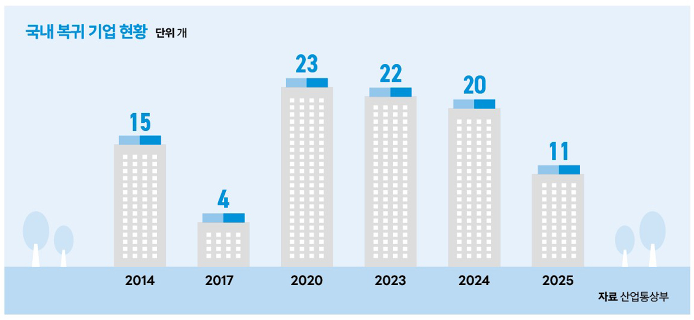 국내로의 생산 복귀 사례는 지난 10년간 150개에 불과하다. 같은 기간 해외로 나간 기업은 1만 개 이상으로 추정된다. 인건비 상승, 수도권 투자 제한 등 국내 경영환경의 어려움이 가중되고 있어 ‘돌아올 필요도, 돌아올 수도 없다’는 입장이다. 이는 우리 중소기업의 리쇼어링에 현실적인 장애 요인이 많음을 시사한다.