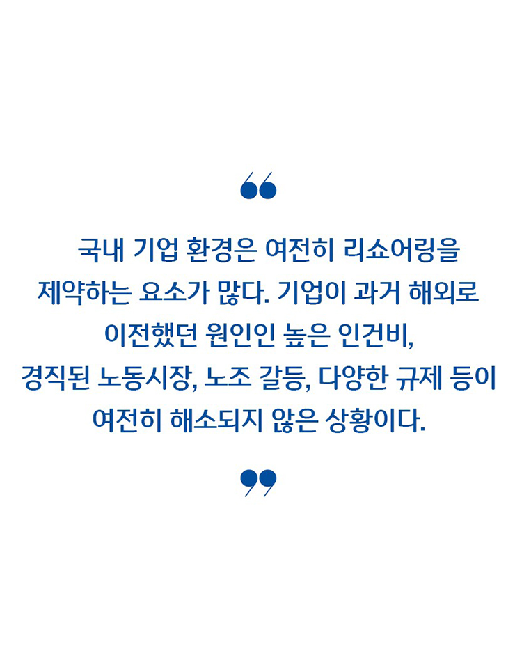 오준석정부는 유턴기업의 법인세·소득세 감면 기간을 7년에서 10년으로 확대하는 등 리쇼어링 관련 세제 혜택을 강화하기로 했다. 이는 유턴기업이 국내 일자리 창출에 기여할 뿐만 아니라 미·중 갈등, 탈세계화, 공급망 재편 등으로 그 중요성이 더욱 커지고 있기 때문이다. 다만 국내 기업 환경은 여전히 리쇼어링을 제약하는 요소가 많다. 기업이 과거 해외로 이전했던 원인인 높은 인건비, 경직된 노동시장, 노조 갈등, 다양한 규제 등이 여전히 해소되지 않은 상황이다. 더불어 행정 절차와 규제가 국제 기준과 괴리된 ‘갈라파고스 규제’로 운영되는 점도 리쇼어링을 가로막는 주요 장애 요인으로 지적된다.