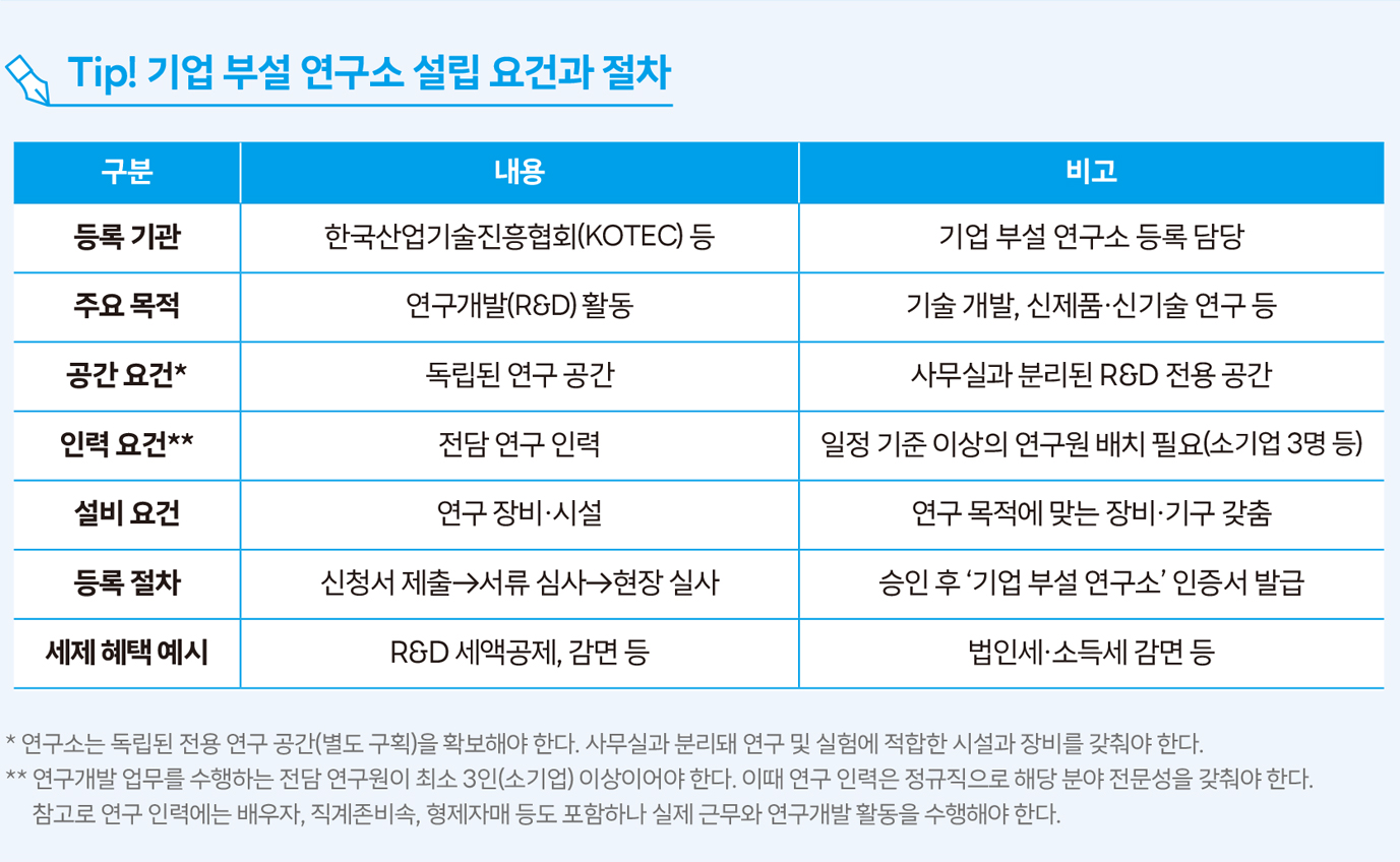 연구소로 인정받기 위해서는 관련 정부 기관(한국산업기술진흥협회)에 정식 등록해야 한다. 연구개발 활동이 주된 목적이어야 하며 별도의 독립된 공간과 연구 인력 등이 필요하다. 기업 부설 연구소 설립에 관한 정보는 ‘기업부설 연구소/전담부서 신고관리’ 홈페이지(www.rnd.or.kr) 등을 참조하자. 필요시 유선 상담 지원도 가능하다.