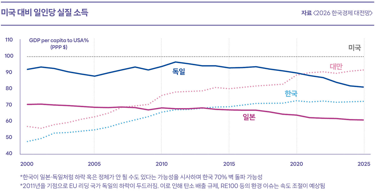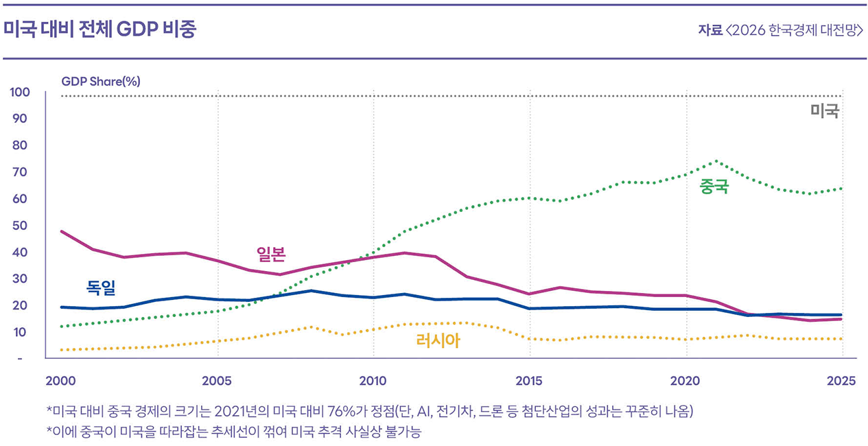 국가별로 보면 독일은 10년 넘게 추락하고 있고, 대만의 경제는 약진하고, 한국은 그나마 현상을 유지하고 있다. G2라고 불리며 미국과 패권경쟁을 하는 중국은 1인당 GDP가 1만3,000달러를 넘기며 고소득 국가로 변하고 있지만 미국 대비 전체 GDP 포션에서 차지하는 비중은 점차 하락해 미국 추격은 사실상 어려울 것으로 전망된다. 2030년에 중국이 미국을 추월한다는 2000년대 초반의 수많은 글로벌 투자은행의 경제 리포트는 명백히 틀렸다.
