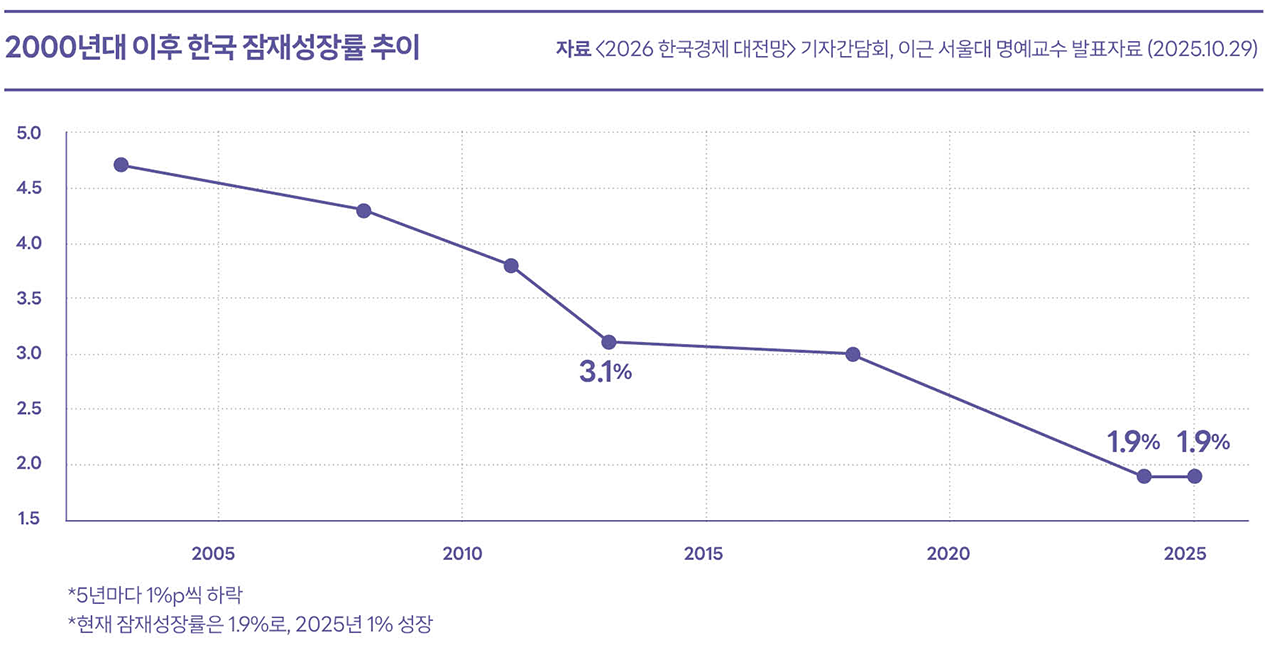 바야흐로 AI의 시대다. 왜 최근 AI가 강조되며, 2026년에 정부는 10조 원의 예산을 AI에 투여한다고 하는 것일까? 이는 한국 경제가 직면한 구조적 한계를 돌파하기 위한 정책적 판단에 가깝다. 최근 25년간의 한국 경제 추세를 보면 한국의 잠재성장률은 5년마다 1%씩 하락하고 있다. 잠재성장률을 높이기 위해서는 생산의 3대 요소(노동, 자본, 생산성 혁신)를 향상시켜야 하는데 노동개혁은 현재 난항이고 역시 투자 증대도 쉽지 않은 상황에서 유일한 해결책이 AI 투자로 기술혁신에 의한 잠재성장률 향상이기 때문이다. 즉 AI는 선택지가 아니라 남아 있는 거의 유일한 카드인 셈이다.