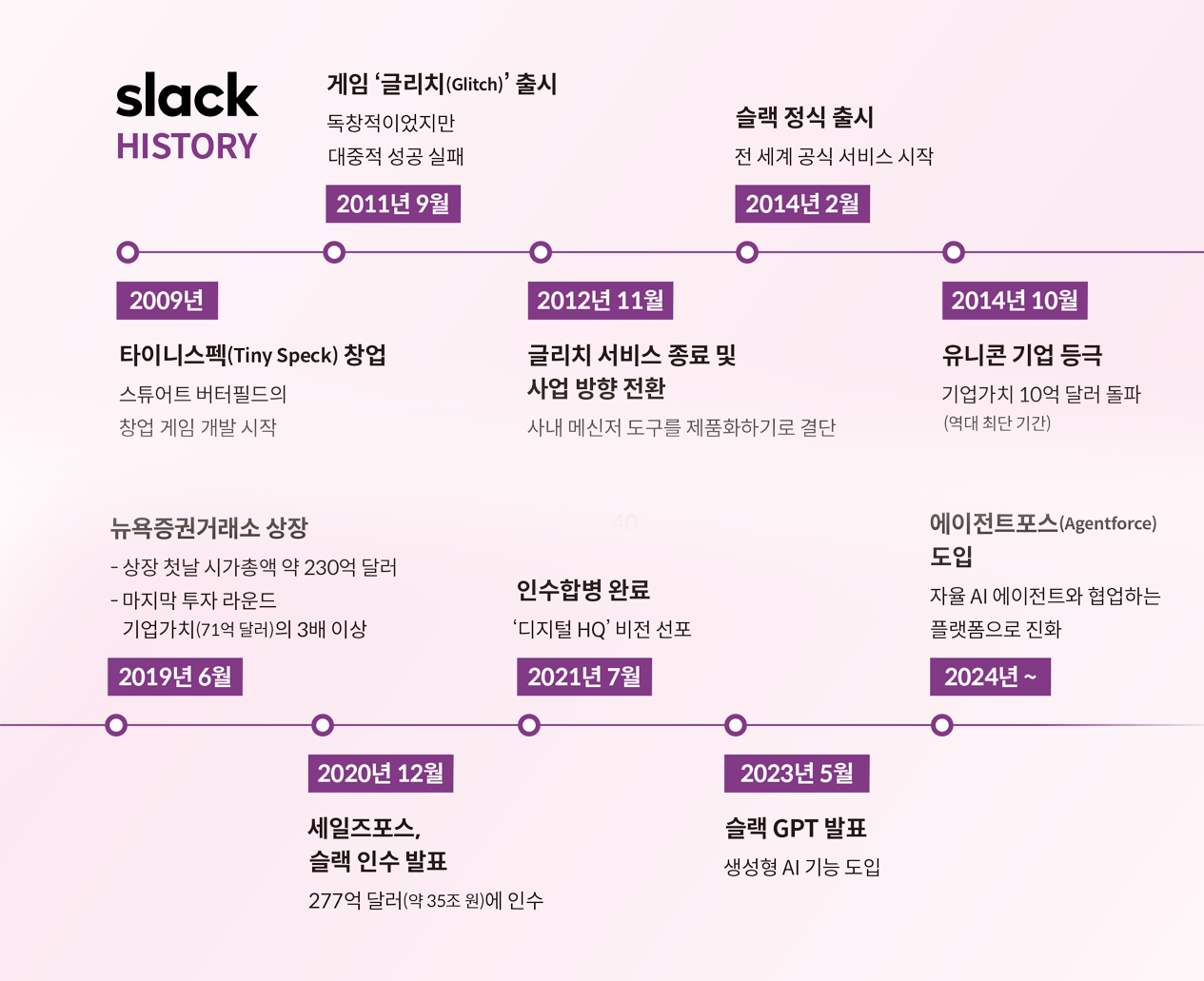 2020년 팬데믹으로 인해 전 세계가 재택근무로 전환됐을 때 슬랙은 또 한 번의 전환점을 맞이했다. 세계 최대의 CRM 기업 세일즈포스(Salesforce)로부터 277억 달러(약 35조 원)에 인수된 것이다. 슬랙은 이제 흩어진 직원들을 연결하는 디지털 본부(Digital HQ)로서의 역할을 자임하게 됐다.