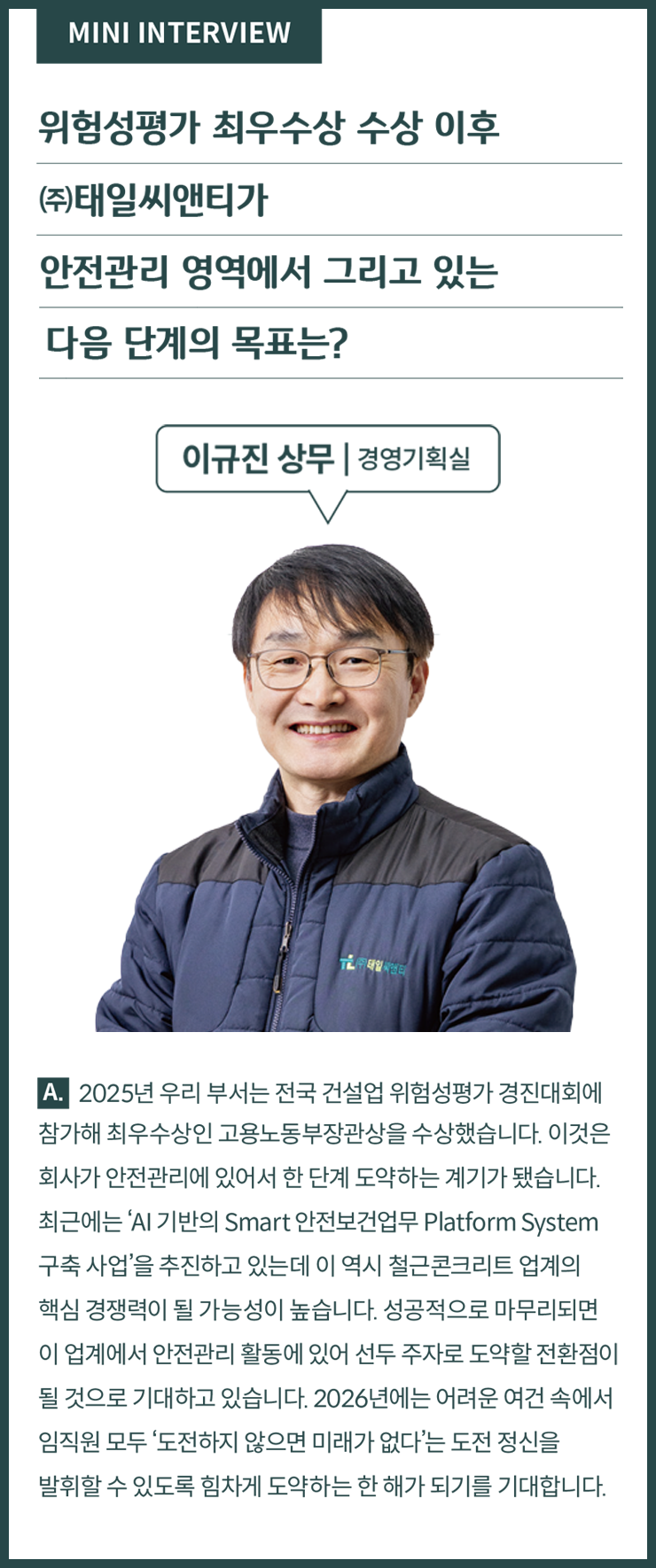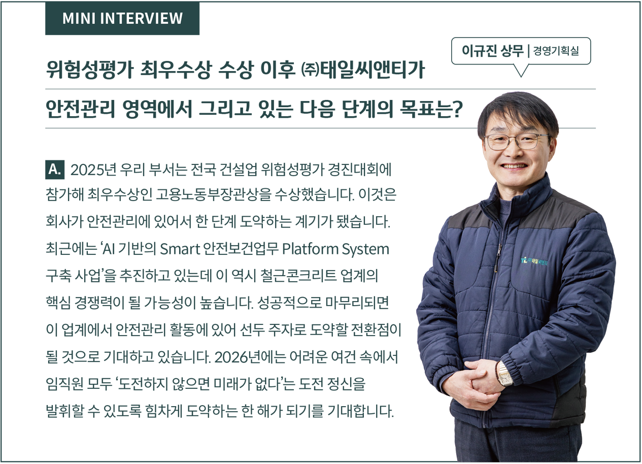‘도전 없는 미래는 없다.’ ㈜태일씨앤티의 슬로건이다. 고난도 시공이 일상이 된 현장에서 기술과 사람, 그리고 다음을 준비해 온 시간들. ㈜태일씨앤티의 이야기는 도전을 전제로 한 선택들이 현장에서 어떻게 쌓여왔는지를 보여준다.