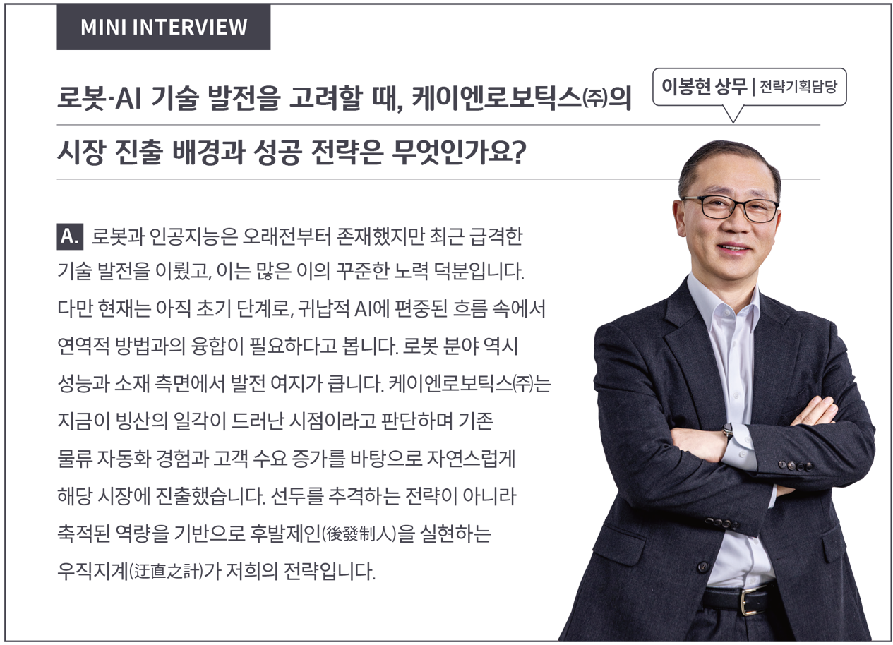 물류 산업은 구조적 전환의 시기에 놓여 있다. 자동화는 이제 경쟁력의 기준이다. 케이엔로보틱스㈜는 현장에서 검증된 기술을 바탕으로 물류 운영 구조를 재설계하고 적용 범위를 넓히고 있다. 케이엔로보틱스㈜의 선택은 그 변화의 한가운데에 있다.