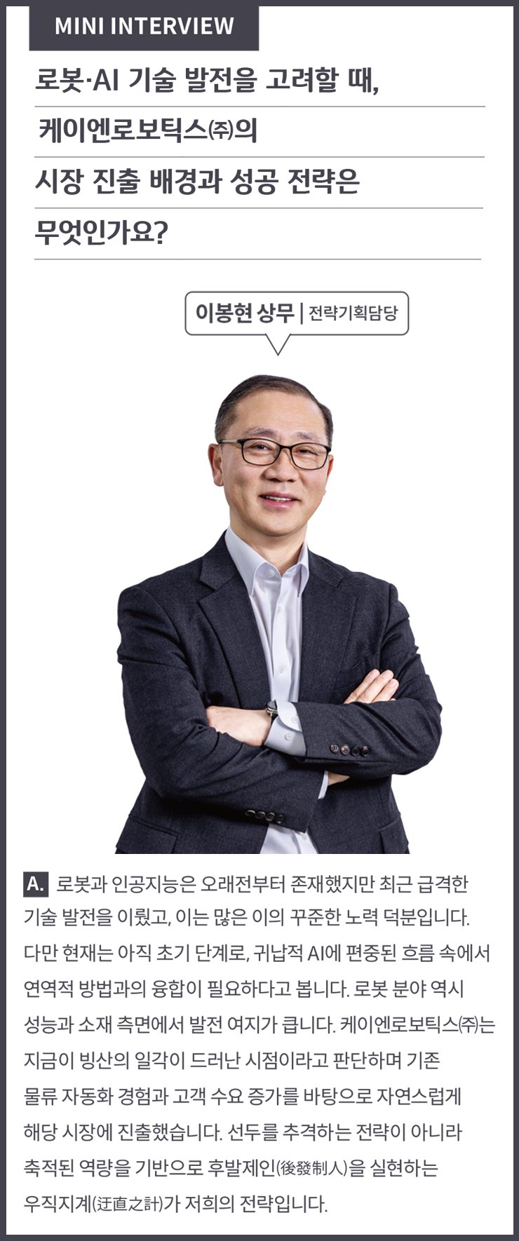 케이엔로보틱스㈜의 시선은 현재의 물류 자동화 성과에 머물지 않는다. 김홍삼 대표는 자동화를 특정 산업의 설비 영역으로 보지 않는다. 기술은 끊임없이 확장돼야 하며 산업 구조 전반을 바꿀 수 있어야 한다는 인식이 바탕에 있다.