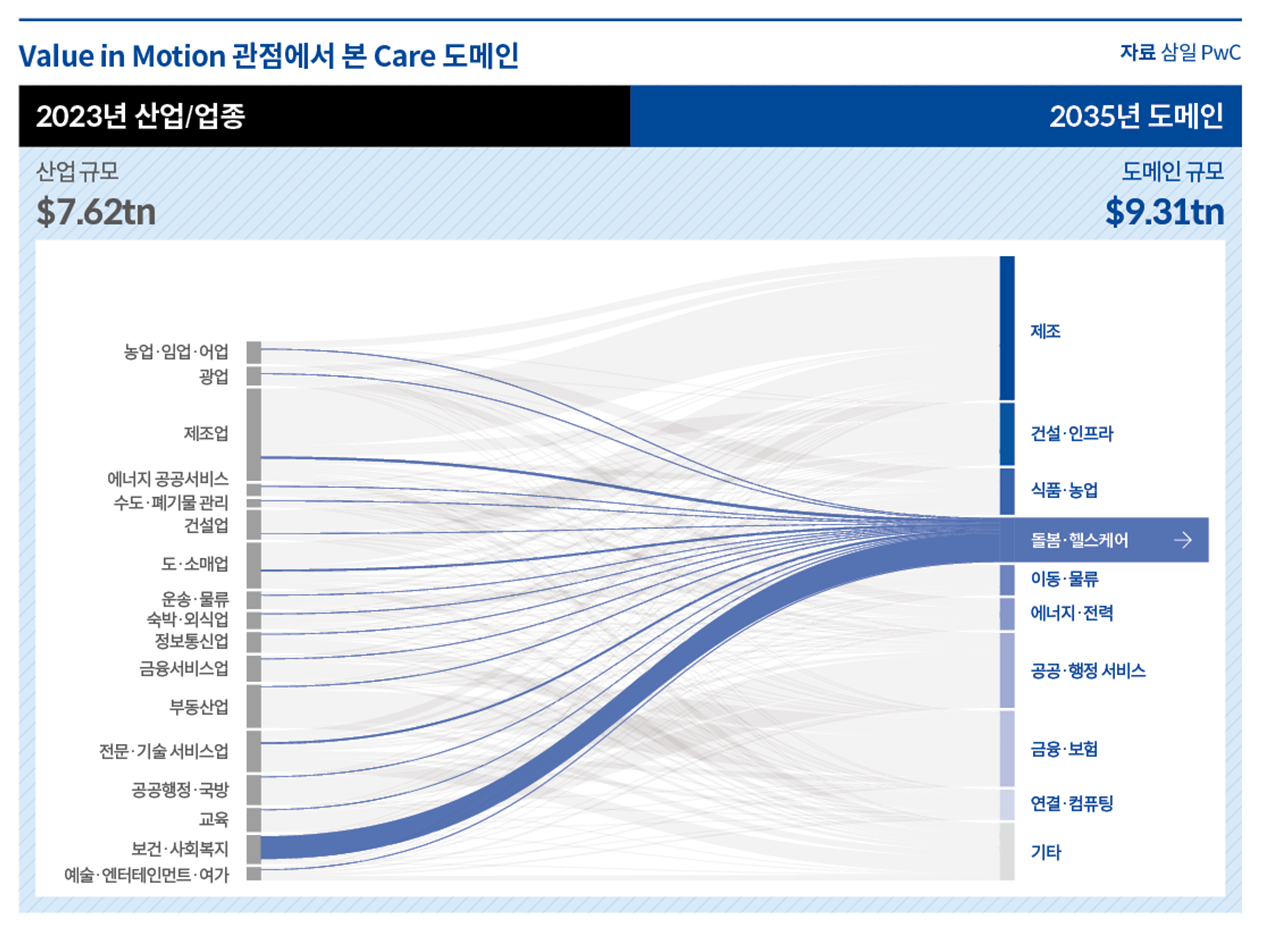 삼일 PwC가 제시한 Value in Motion 관점도 같은 맥락이다. 산업을 상자처럼 나누는 대신 인간의 삶을 따라 이동하며 재구성되는 가치의 흐름(Value Flow)으로 시장을 이해해야 한다는 것이다. 제조·금융·의료처럼 고정된 업종 구분은 더 이상 유효하지 않다. AI와 데이터 기반 경제에서는 가치가 특정 산업 안에 머무르지 않고 고객의 일상 전반으로 확장된다. 이 시각에서 보면 헬스케어는 더 이상 ‘의료’ 카테고리에 한정되지 않는다. 인간의 하루를 구성하는 수면, 식습관, 운동, 스트레스 관리, 질병 예방 등 다양한 돌봄의 순간 모두를 아우르는 Care 도메인1)으로 확장된다.