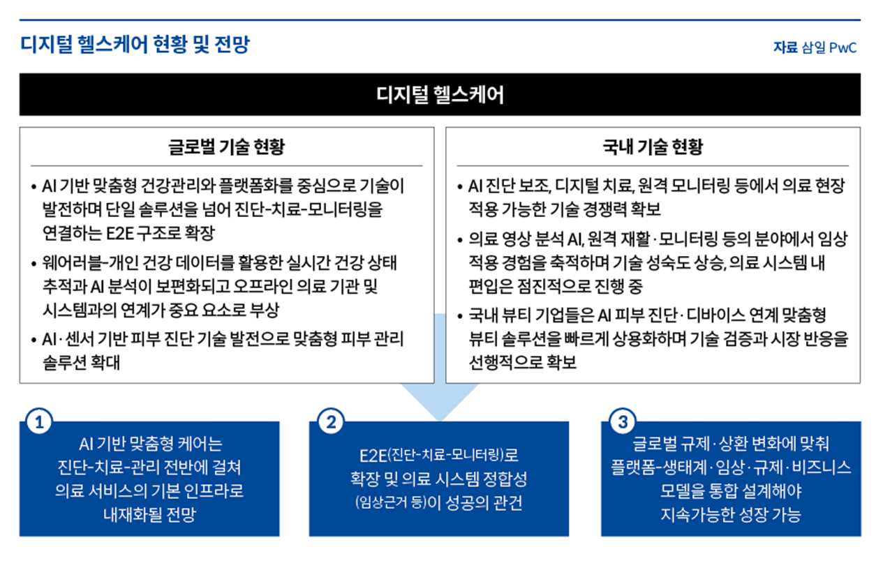 개인이 자각하지 못하는 순간에도 데이터는 계속 축적·해석되고, 헬스케어는 더 이상 병원에서만 이뤄지는 행위가 아니라 생활 속 자연스러운 서비스가 됐다. 이러한 변화는 돌봄의 개념 자체를 재정의하고 있다. 돌봄의 순간이 일상에 스며든 만큼 돌봄은 기존 산업을 넘어서는 새로운 가치 흐름으로 자리 잡았고 삼일 PwC가 정의한 Care 도메인의 핵심 특징인 예측성, 초개인화, 연속성이 기술 발전과 함께 현실화되는 모습을 확인할 수 있었다.