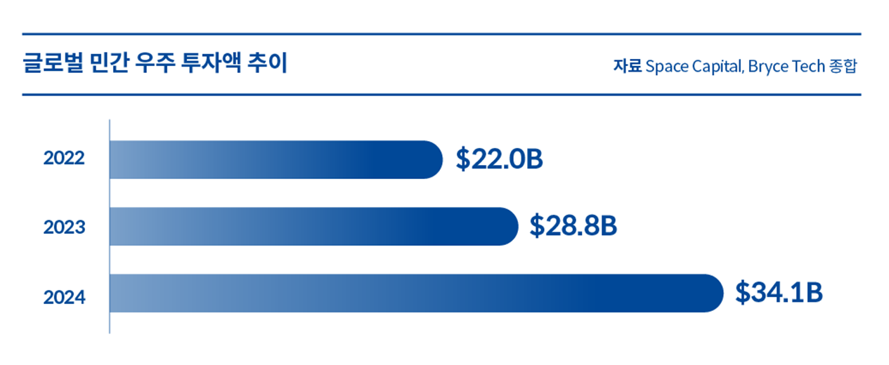 투자액은 2015년 약 20억 달러에서 2024년 약 341억 달러로 10년 만에 17배 이상 증가했다. 특히 2020~2022년 구간에서 코로나19 이후 저금리 유동성 팽창과 맞물려 투자가 급증했으며 이 기간은 SPAC(기업인수목적회사)을 활용한 우주 기업 상장 러시와 일치한다. 하지만 일부 기업은 이미 파산하거나 상장 폐지됐으며 과대평가 우려가 지속되는 기업도 상당수 포함됐다.