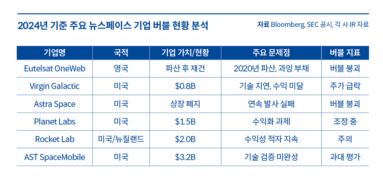 2020~2022년 사이 버진갤럭틱, 아스트라 스페이스, 로켓랩, AST SpaceMobile 등 10개 이상의 우주 기업이 SPAC을 통해 뉴욕증권거래소 또는 나스닥에 상장했다. 이들 기업의 평균 공모가 대비 현재 주가는 약 75% 하락했으며, 아스트라 스페이스는 2023년 상장 폐지됐다. 버진갤럭틱의 경우 2021년 시가총액이 최대 60억 달러를 기록했으나 반복되는 기술 지연과 기대치 미달로 2024년에는 10억 달러 미만으로 급락했다. 이는 실제 수익 창출 능력이 아닌 미래 기대감만으로 형성된 가치평가의 전형적 붕괴 패턴이라고 볼 수 있다.
