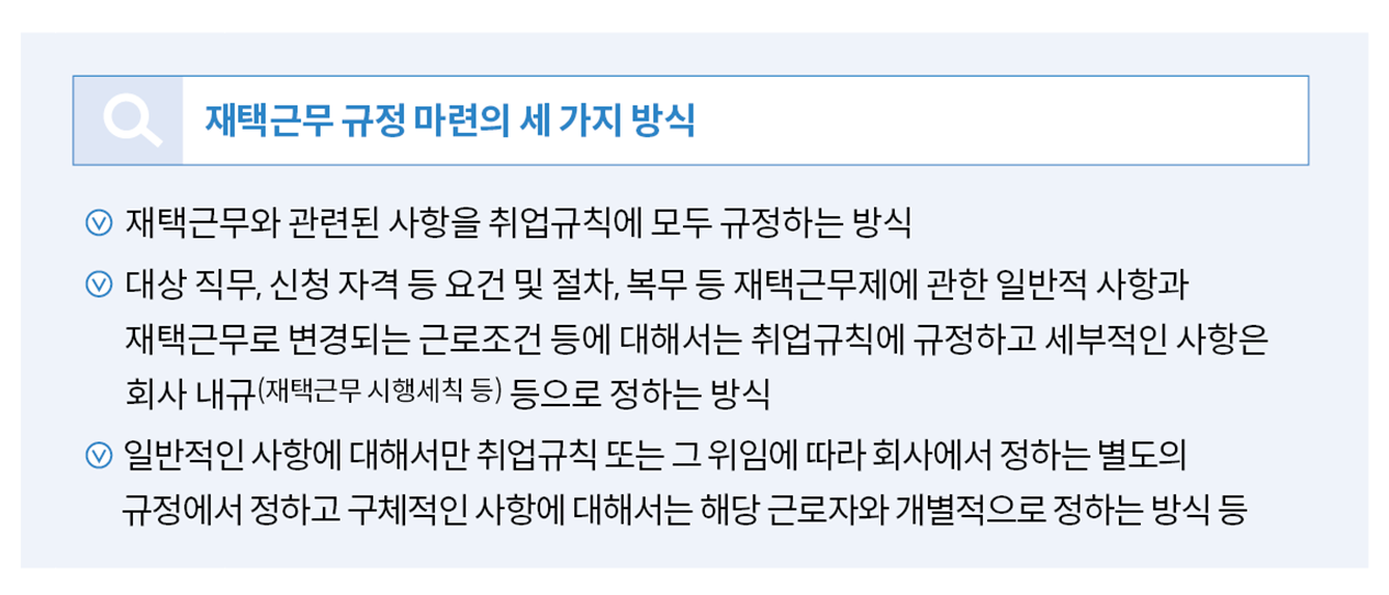 재택근무는 취업규칙에 반드시 명시해야 하는 사항은 아니지만 상시 운영 시 예측 가능성을 위해 규정을 두는 것이 바람직하다. 이 경우 취업규칙 변경 절차에 따라 노동조합(또는 근로자 과반수)의 의견을 청취해야 한다.