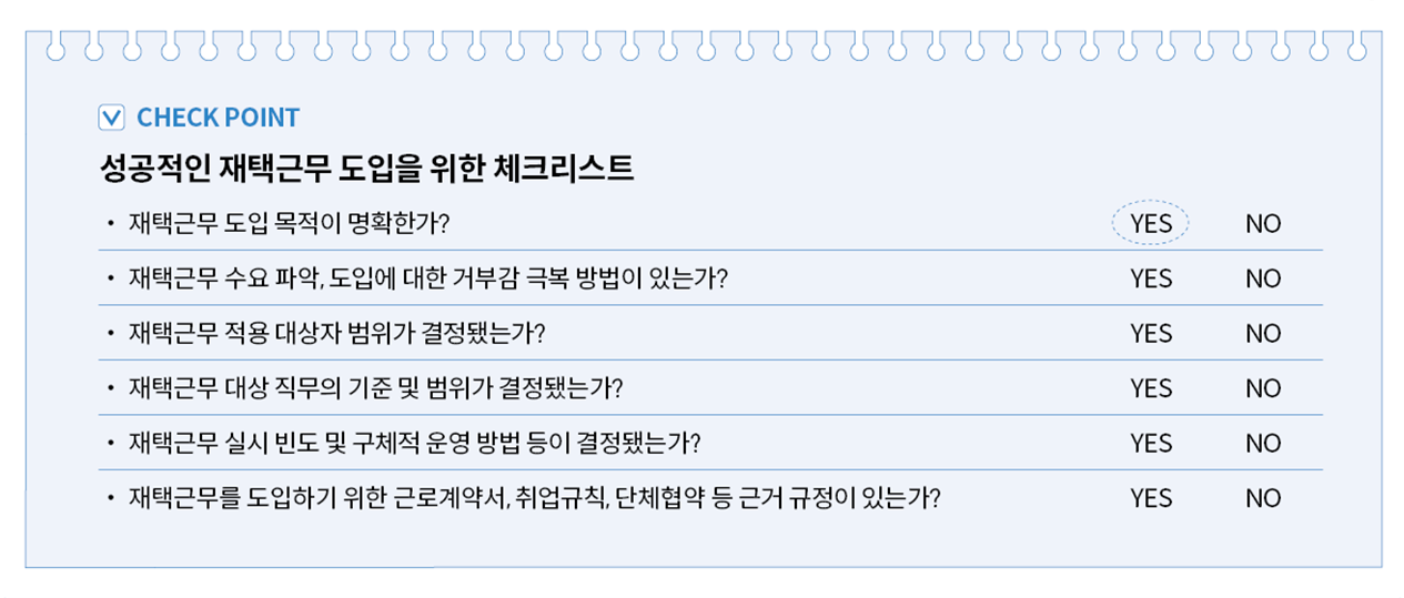 따라서 회사는 온라인 출퇴근 기록, 정기 화상회의, 근무일지 작성, 착석 상태 확인 등을 통해 업무 수행을 점검할 수 있으며 보안지침 준수 여부도 함께 관리해야 한다.